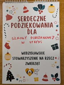 Z radością informujemy, że dary zebrane podczas szkolnej zbiórki w Szkole Podstawowej w Syryni zostały przekazane do schroniska dla zwierząt prowadzonego przez Stowarzyszenie „Koty, Psy i My” z Wodzisławia Śląskiego.